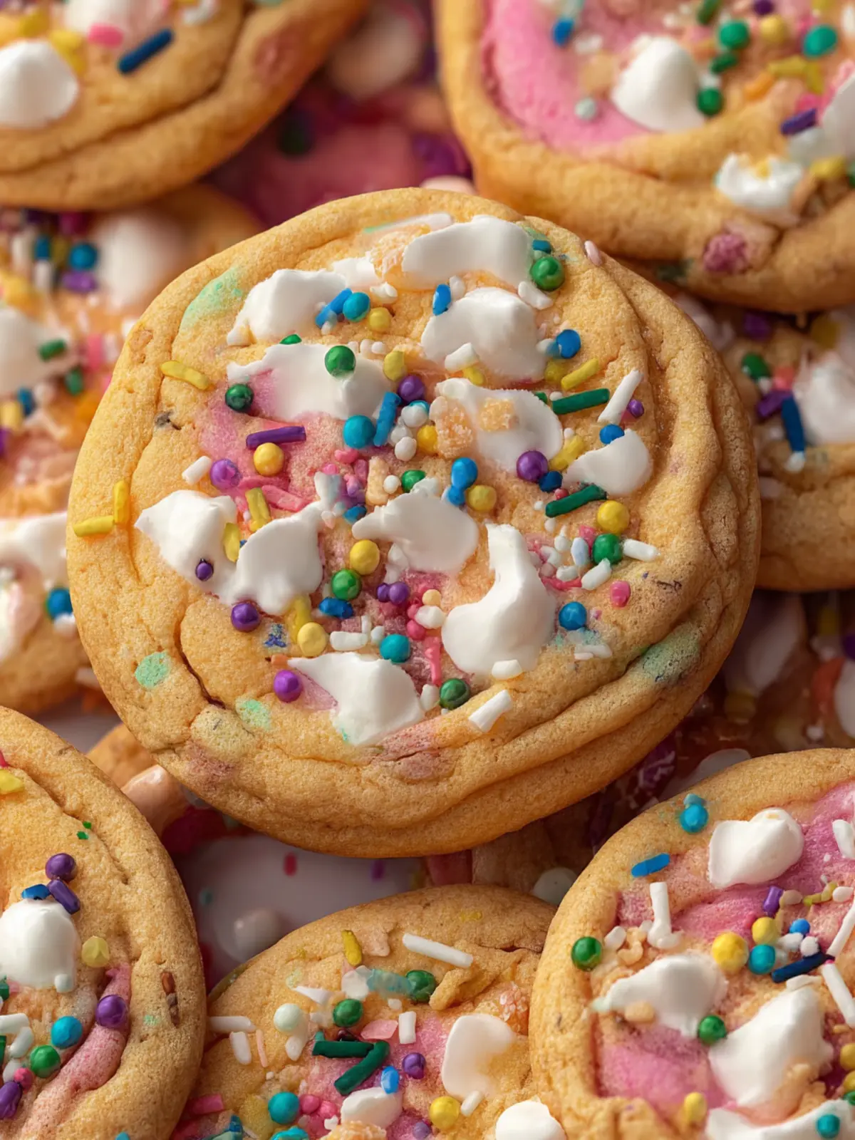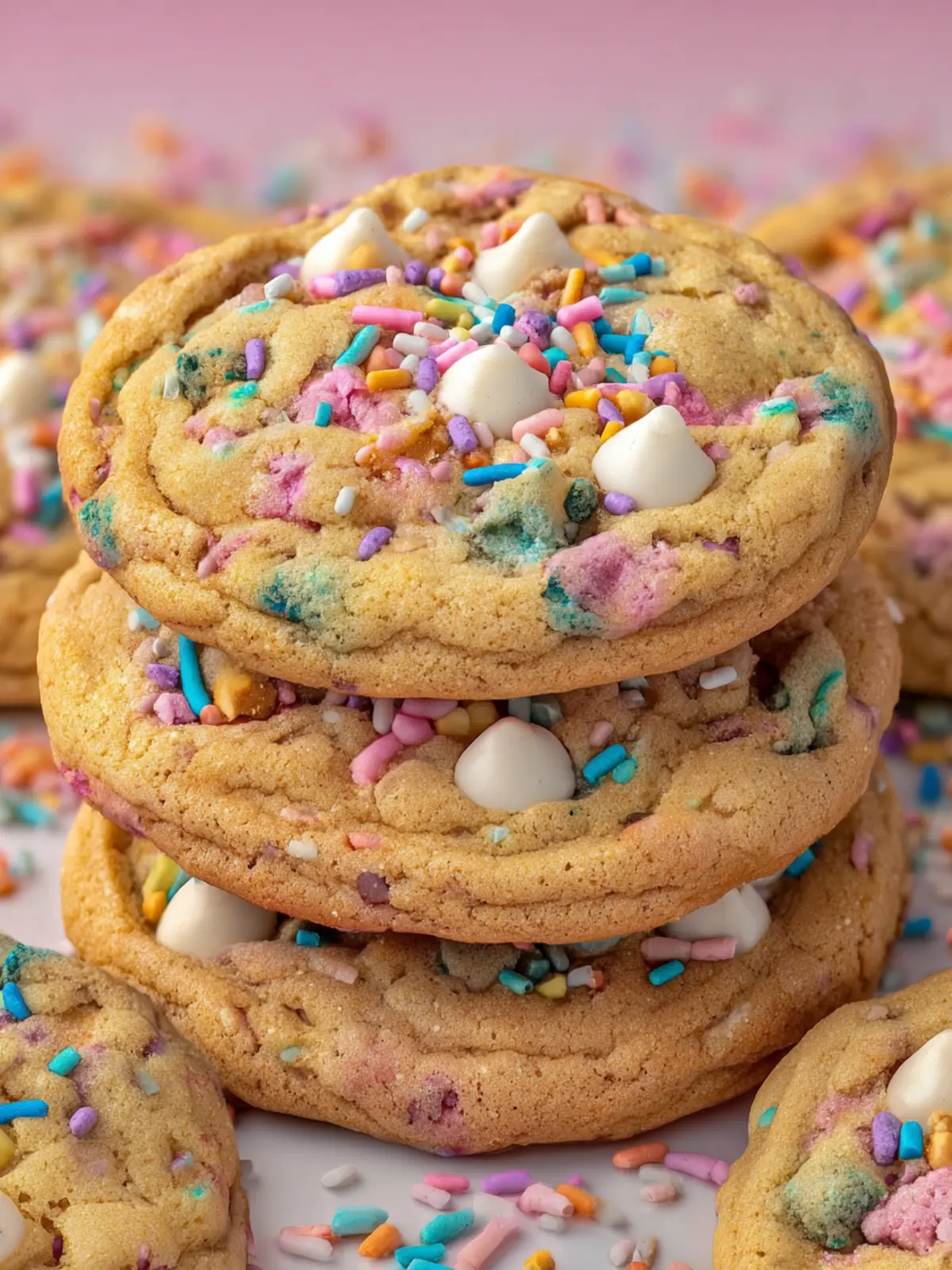 Delicious cookies filled with rainbow sprinkles and white chocolate chips, perfect for any celebration!