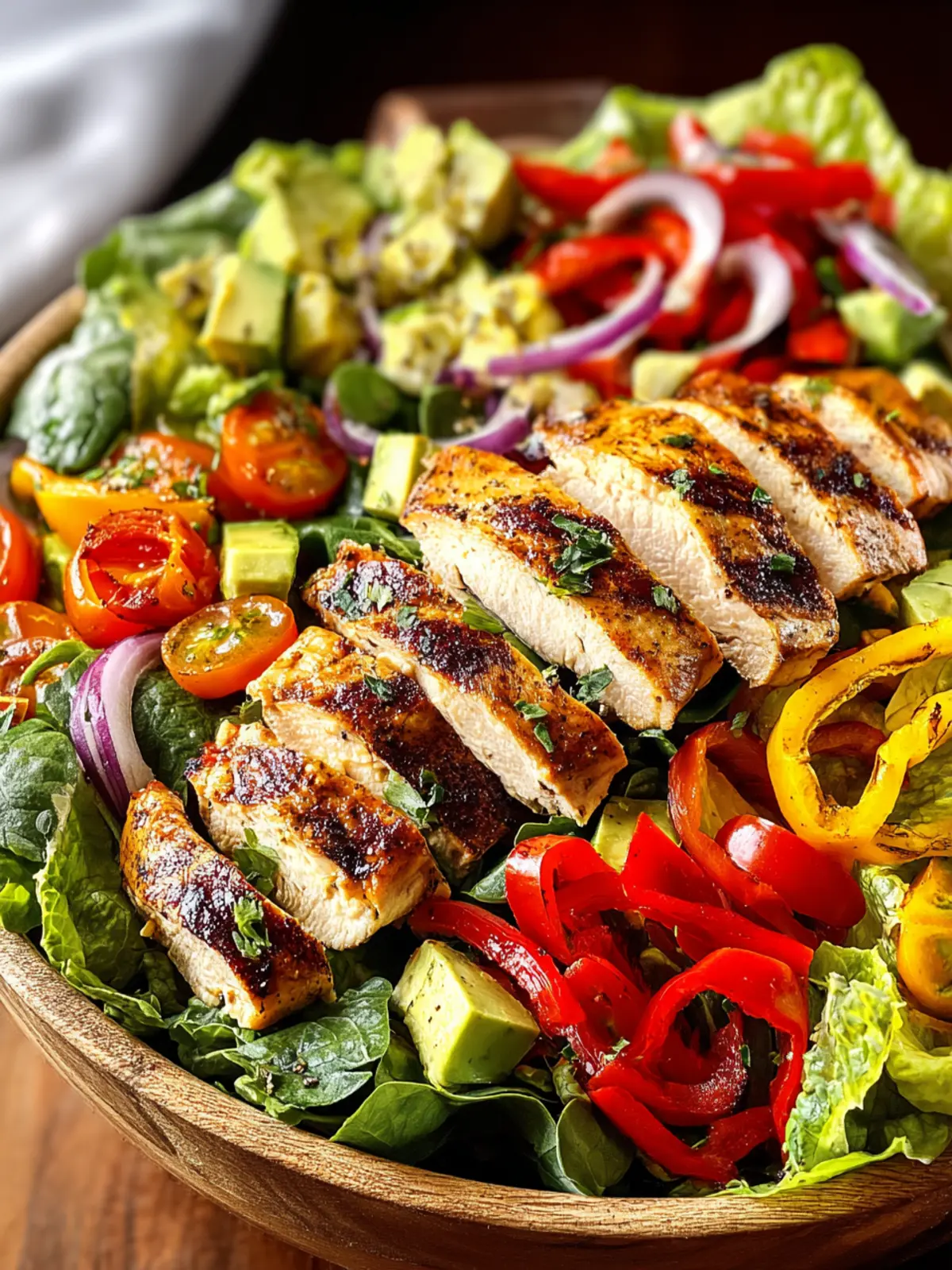 Chicken: For a juicy and tasty salad, I recommend using boneless, skinless chicken breasts. Marinating the chicken with lime juice and fajita seasoning before grilling will enhance its flavor and tenderness, making each bite truly delightful.