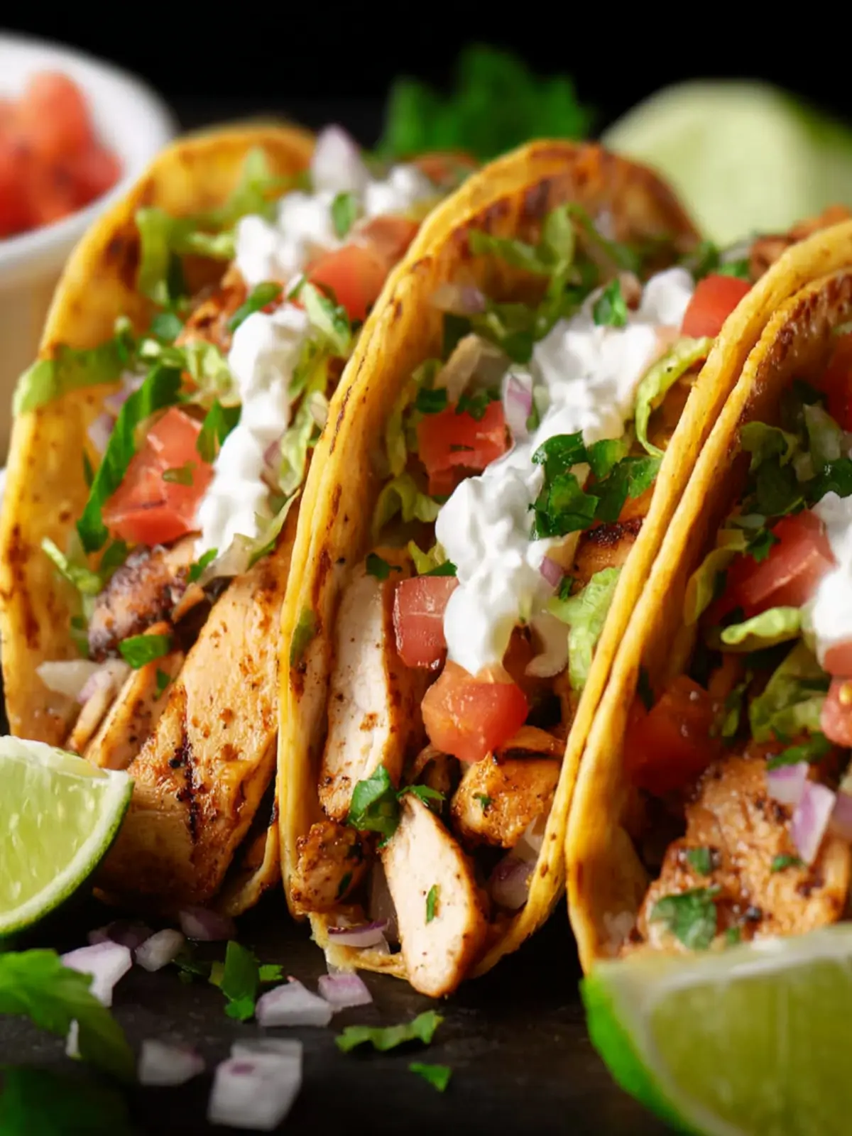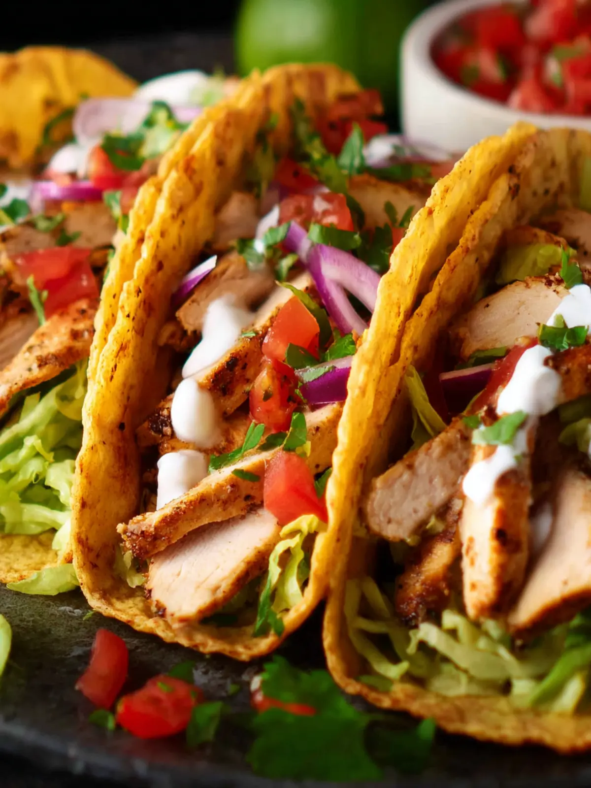 Delicious chicken tacos with marinated chicken, cheese, salsa, sour cream, and lettuce, wrapped in warm corn tortillas.