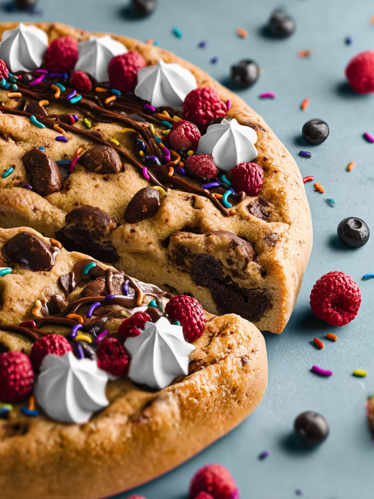A delicious chocolate chip cookie cake topped with creamy frosting and rainbow sprinkles.