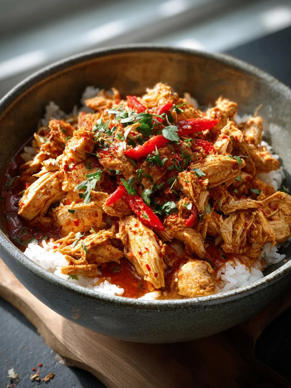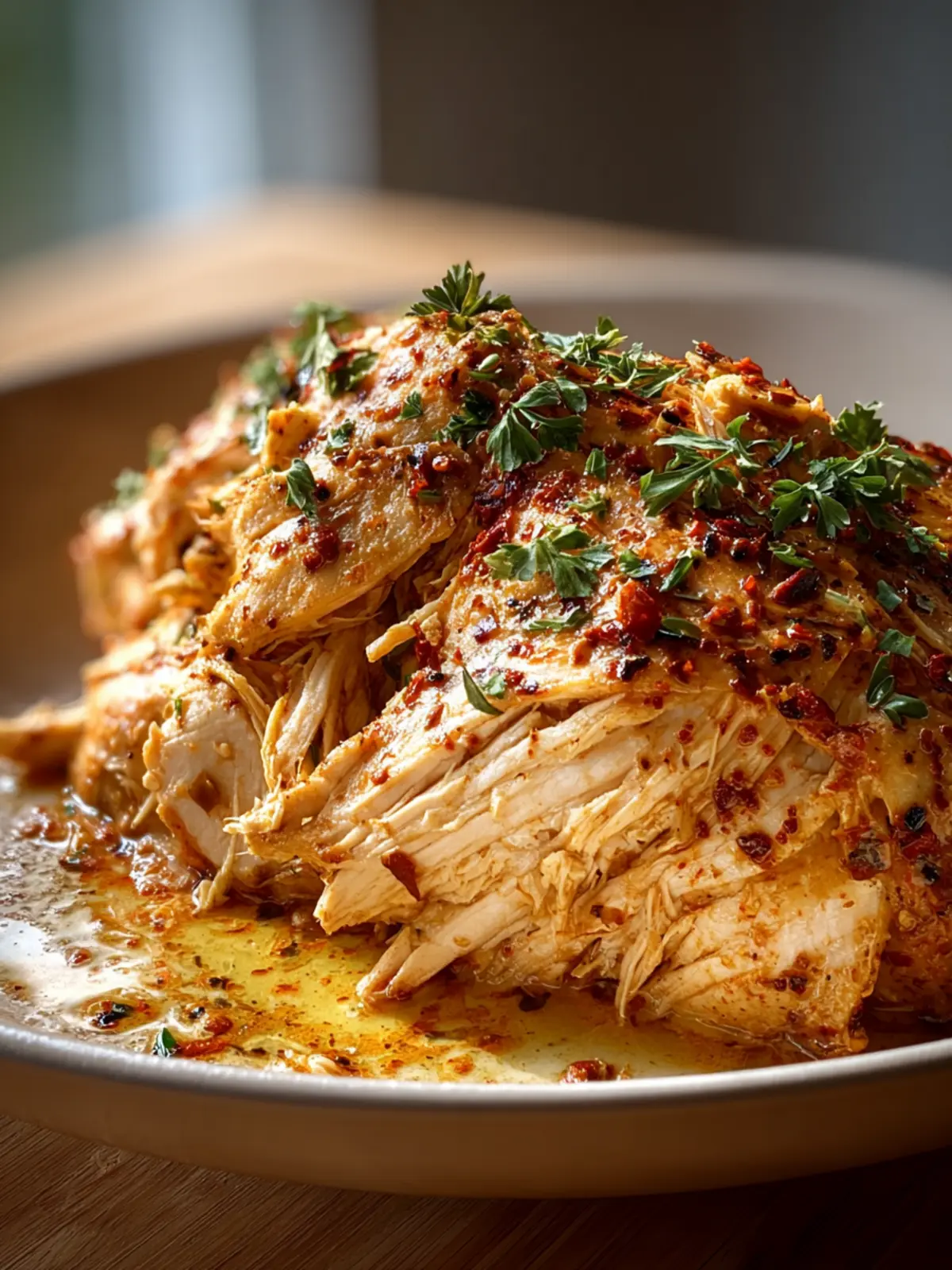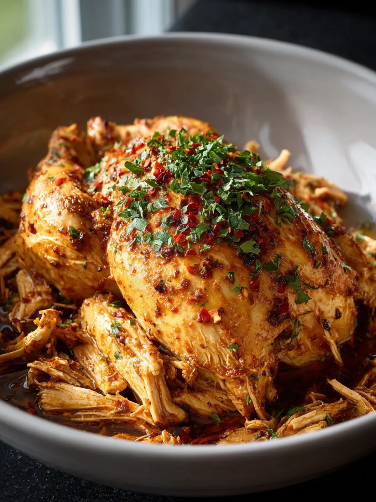- Shred the chicken and mix it with the juices before serving.