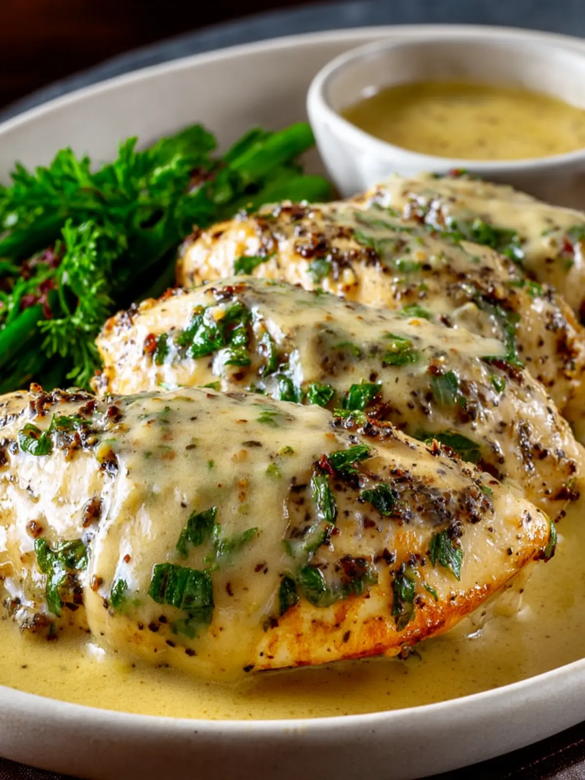 10. Serve the Dijon mustard chicken hot, with a little sauce spooned over each piece of chicken, garnishing with fresh parsley if desired.