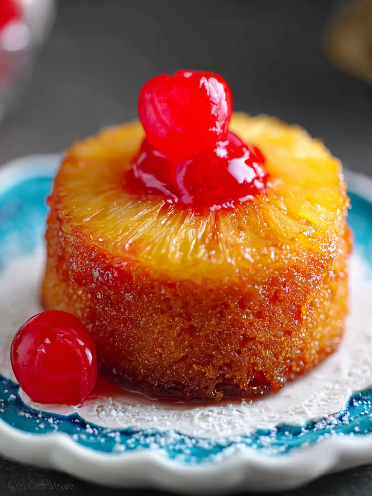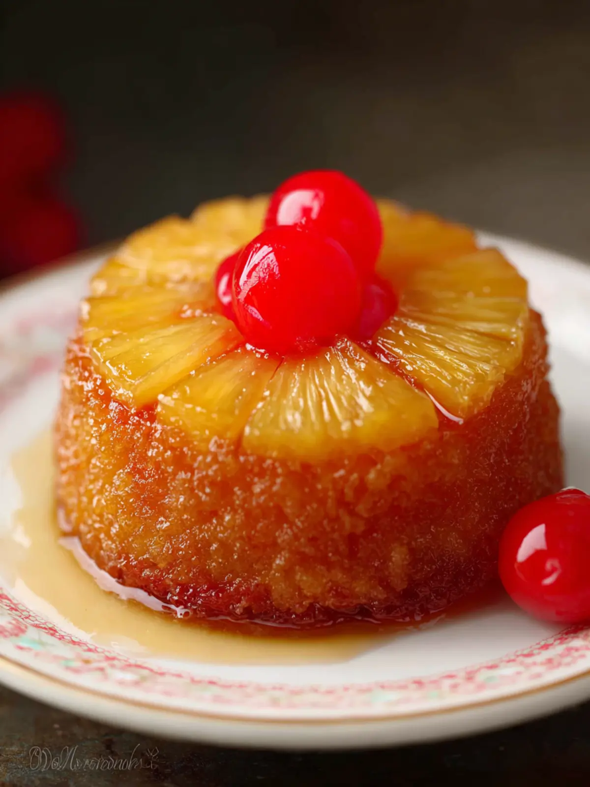 This delightful pineapple upside down cake is baked in a ramekin for an individual serving. Topped with a slice of pineapple and a maraschino cherry, this treat is both delicious and easy to make.