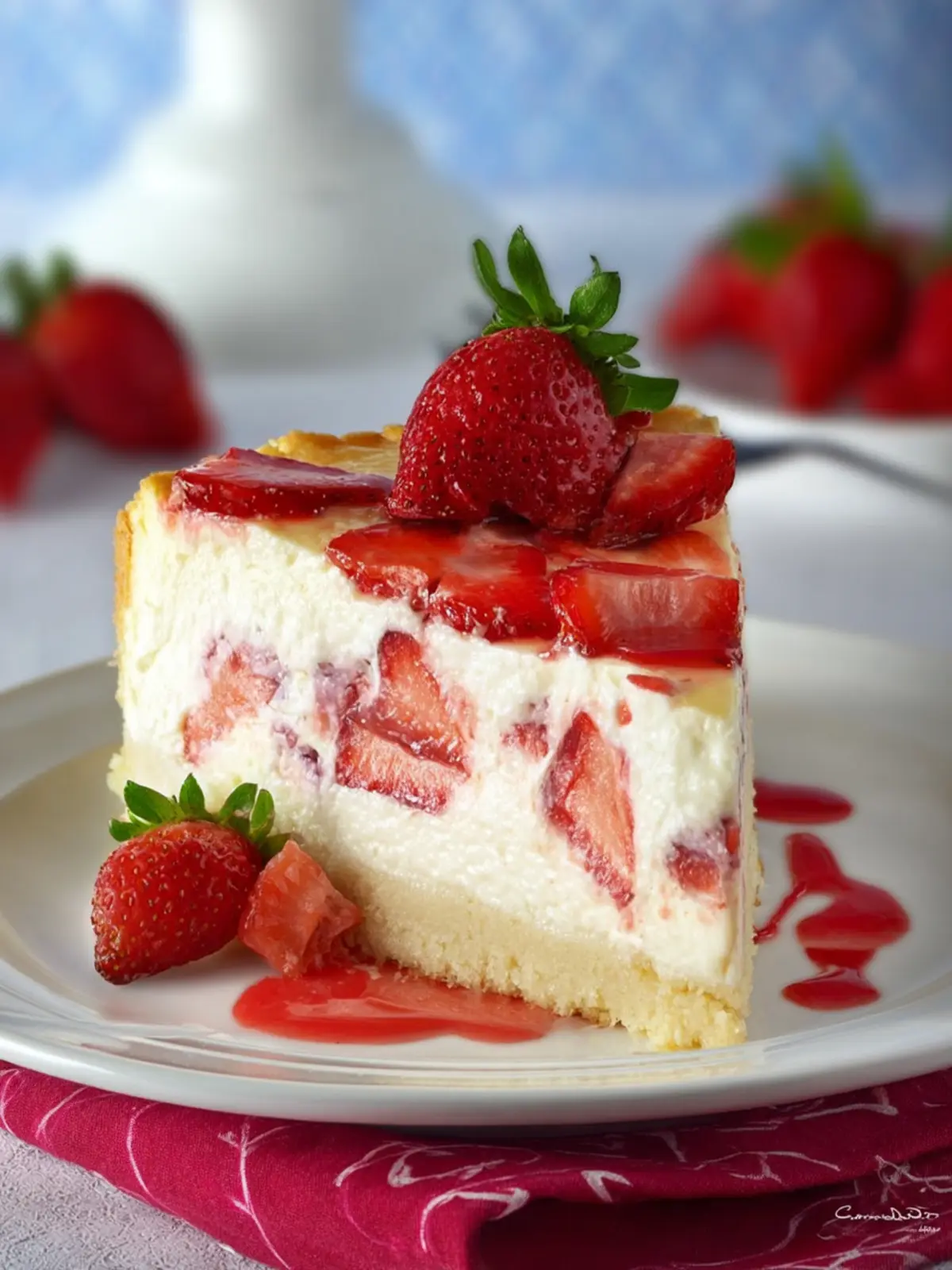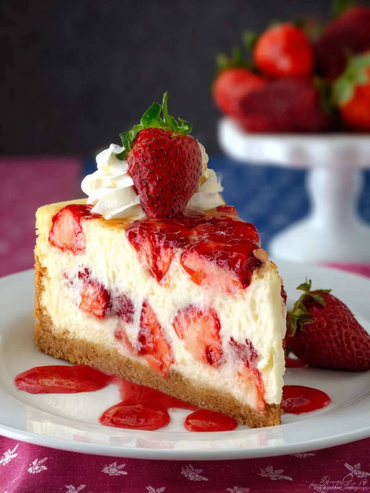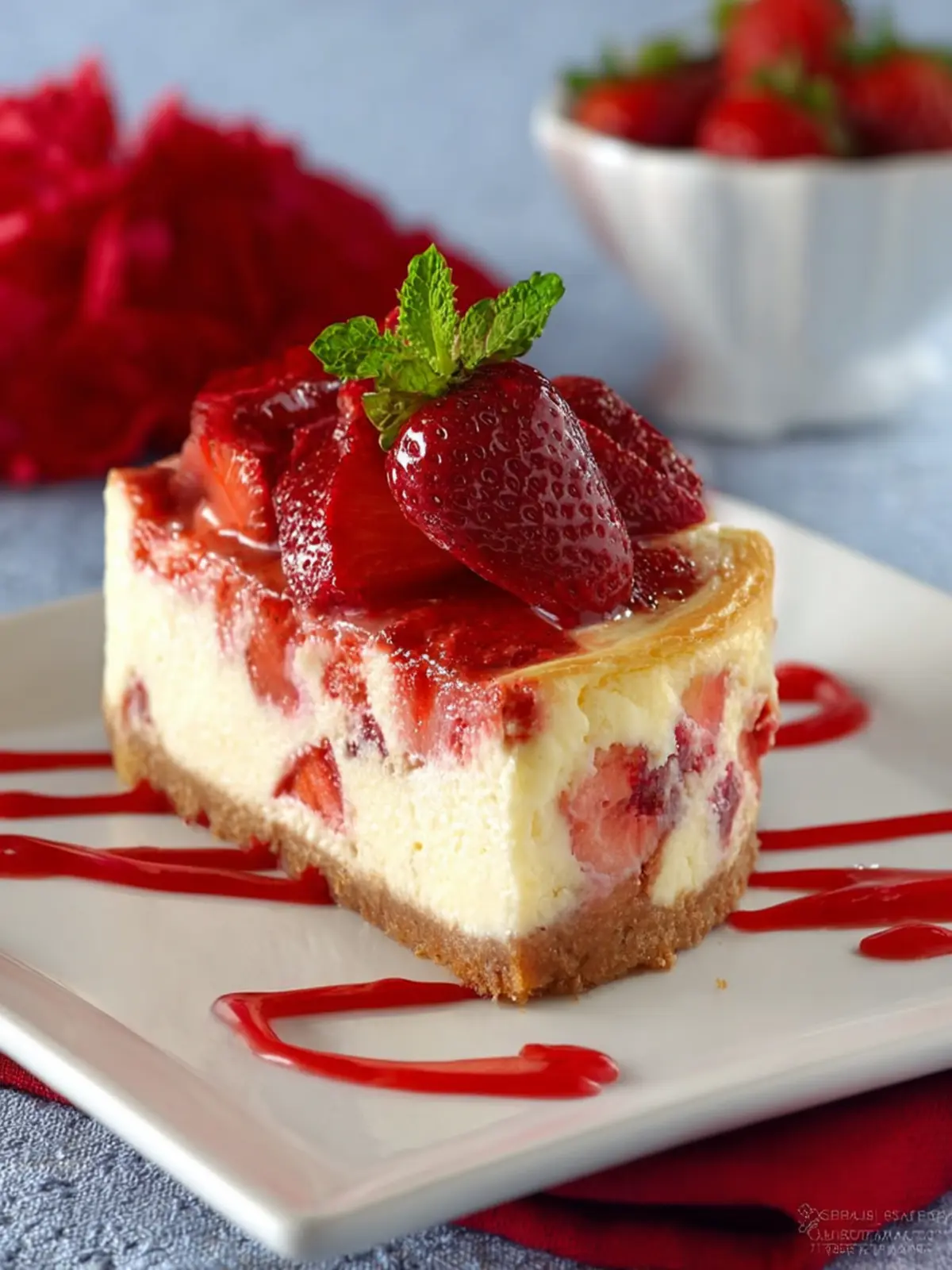 • Layered Look: Serve in clear dessert cups to showcase the cake’s layers of strawberries and creamy cheesecake.